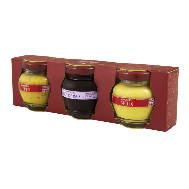 Partez à la découverte des saveurs originales de la moutarde avec cet assortiment de trois délicieuses recettes: la Moutarde aux Cèpes, la Moutarde au Moût de Raisin et la Moutarde aux Noix en pots de 55g. Un cadeau idéal à offrir pour les amoureux de la gastronomie.