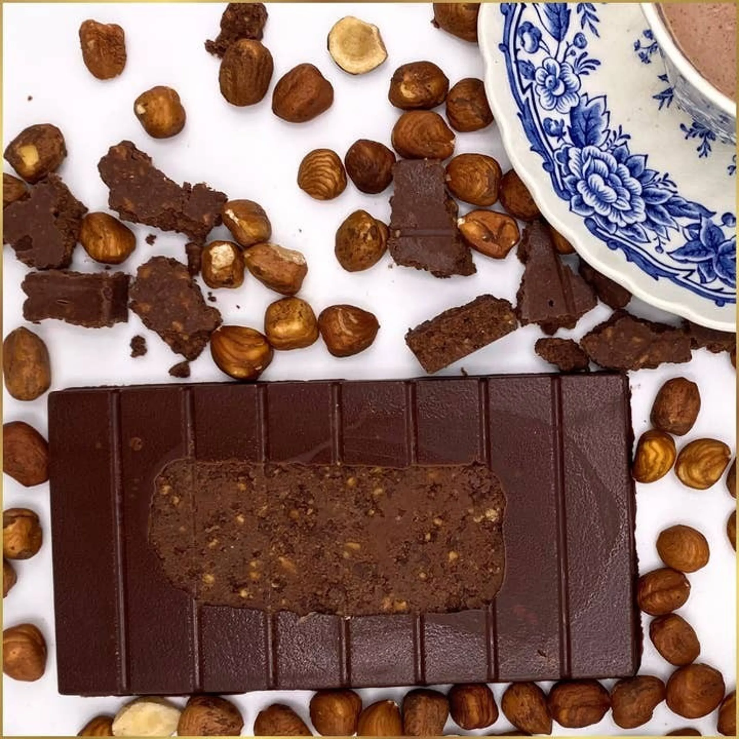 57 % Chocolat noir (sucre, beurre de cacao, chufa, pâte de cacao, coco déshydratée, vicia faba, lécithine de tournesol, vanille), 14 % noisette, cassonade, farine de riz, graisse de coprah, farine de sarrasin, cacao poudre, sel de Guérande.